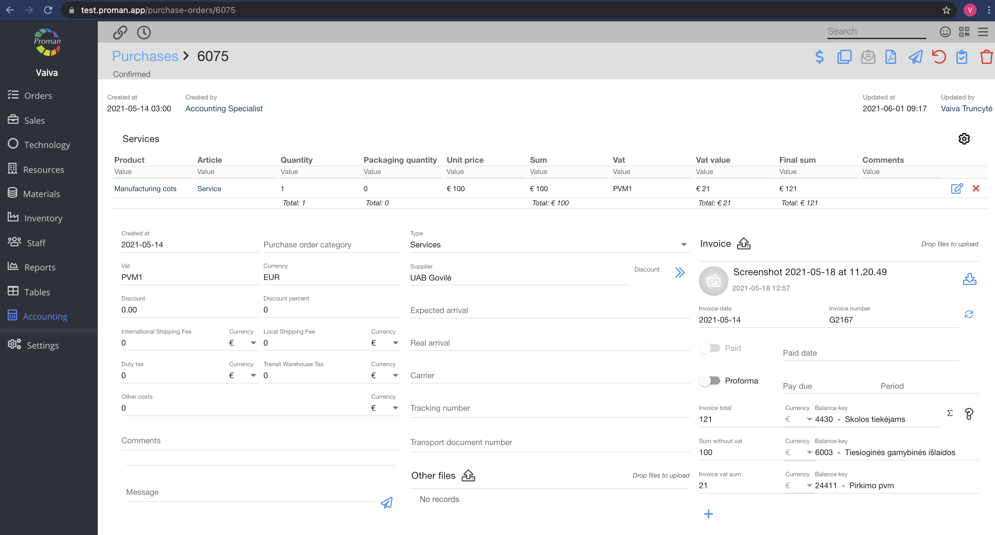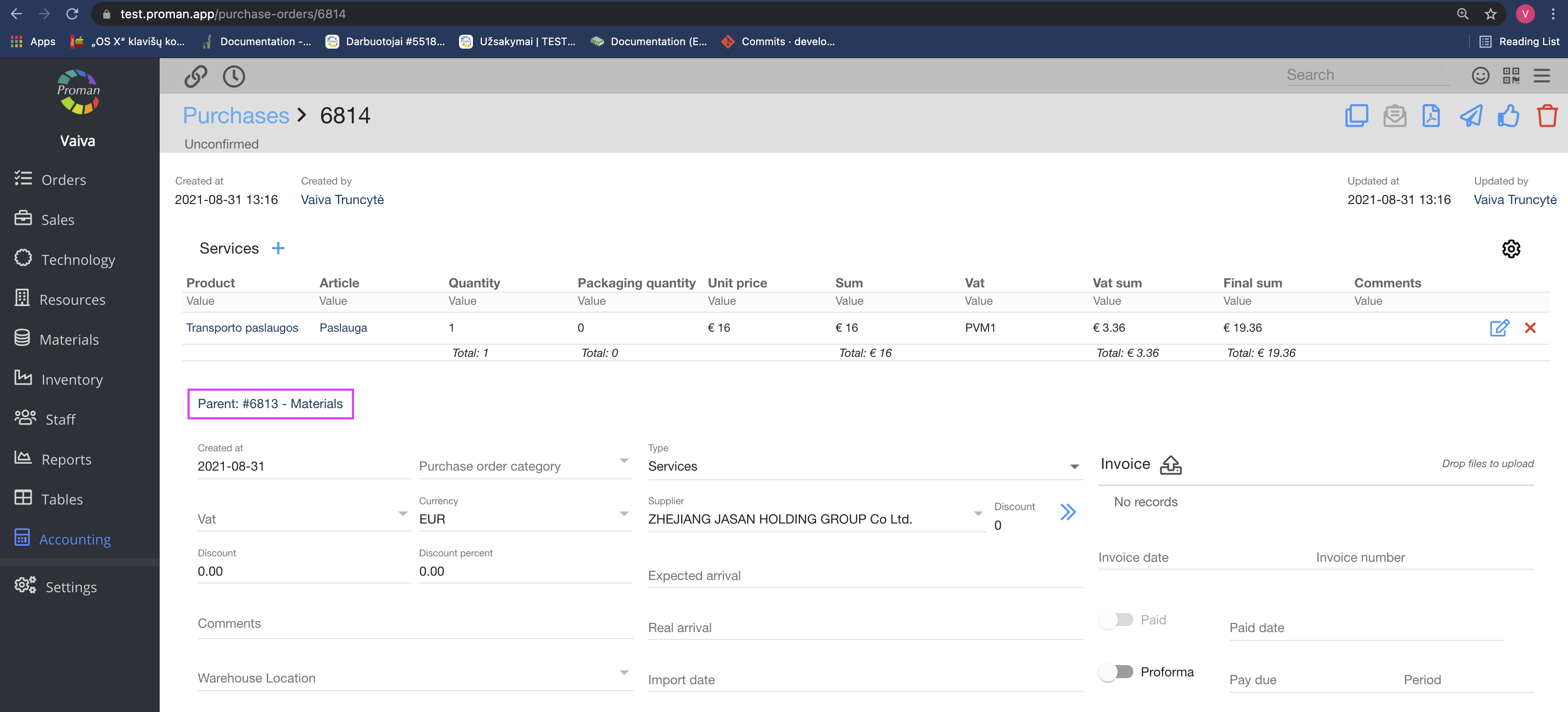 5. Click onand choose services you want to relate purchases to. Both of these purchases are summed in the materials costs (sum is without VAT)