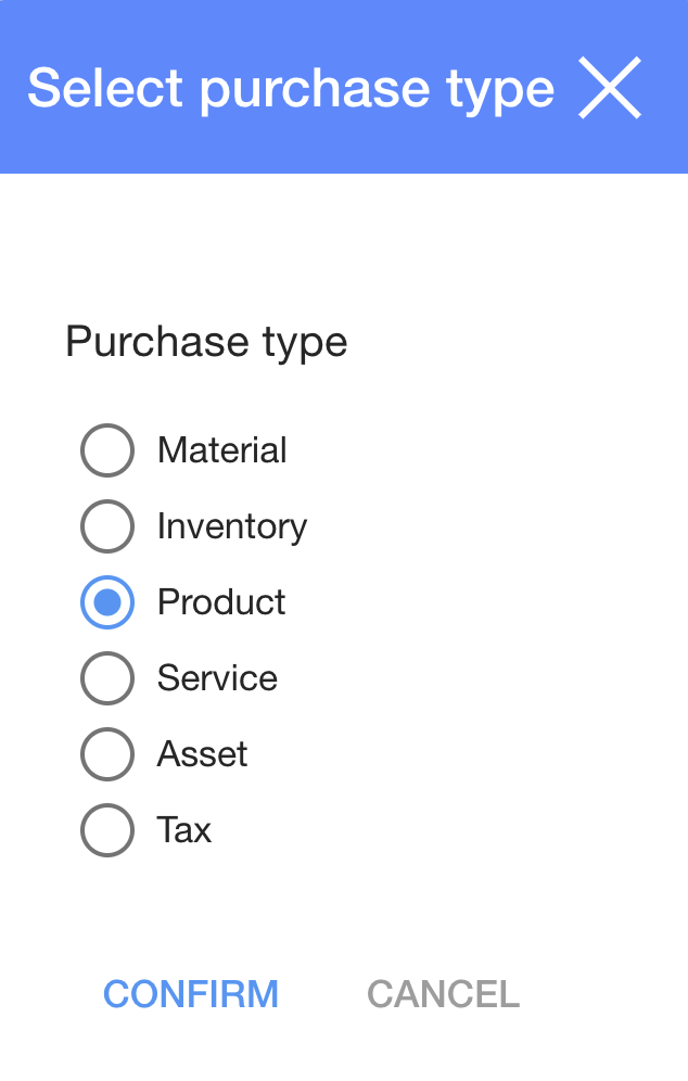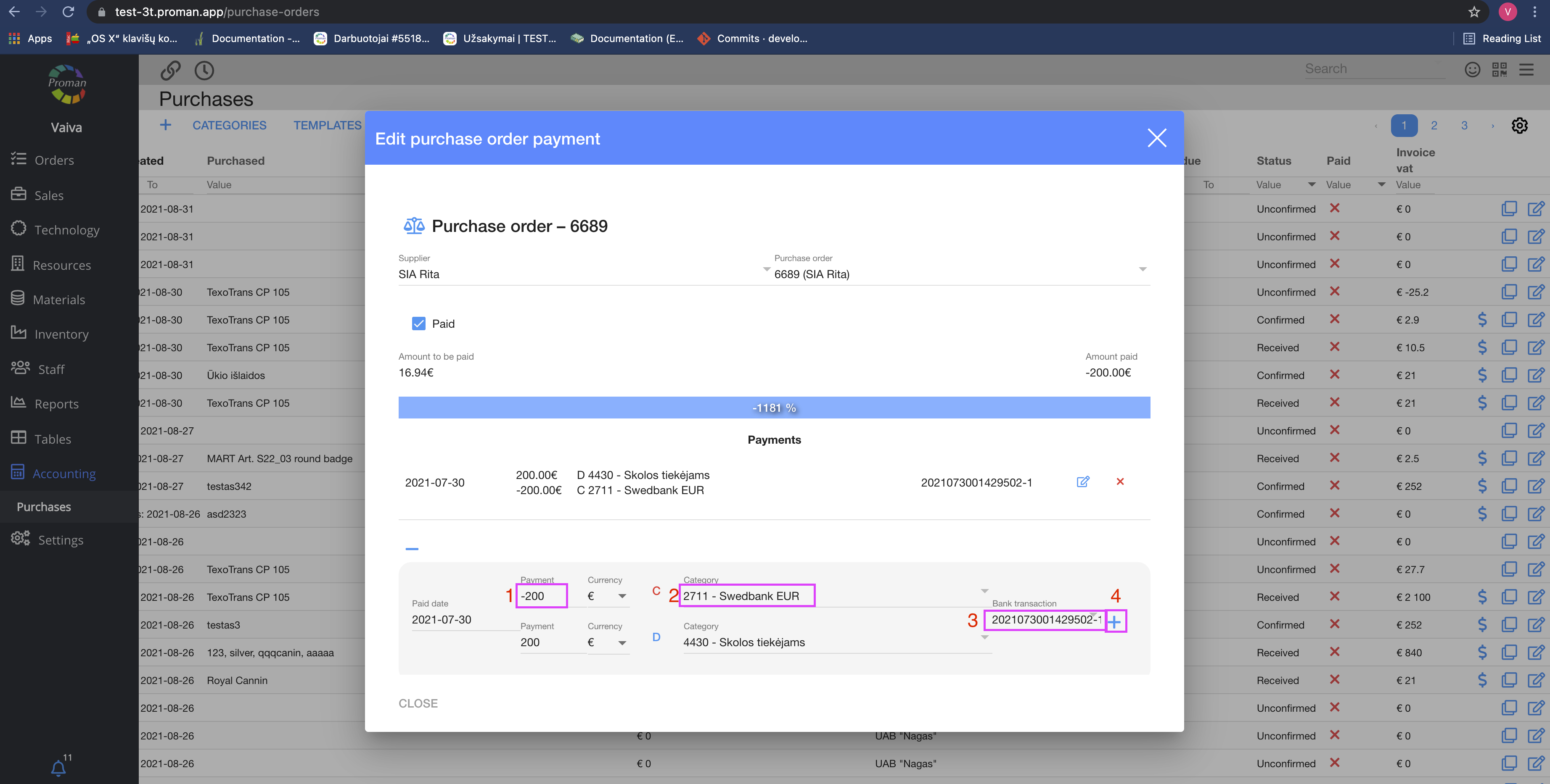 5.4. Category (if necessary; here you can add a purchase's category in order to have information about the purchase. You can find purchase categories in the purchases table (at the top of the page));