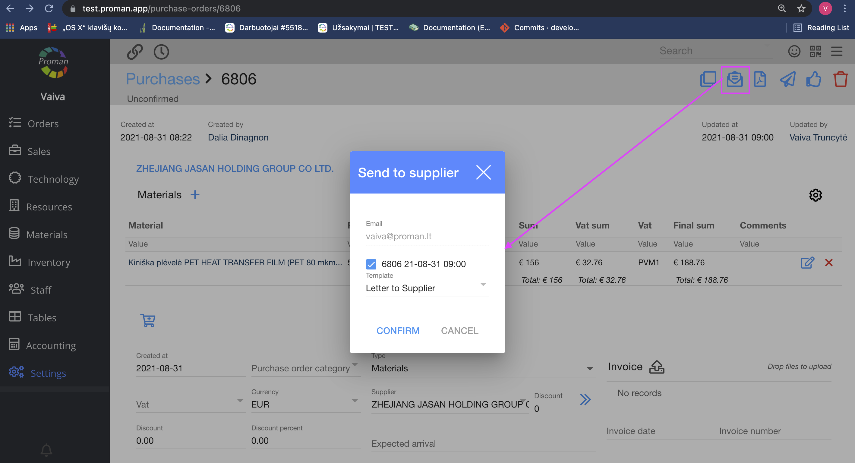 4. To send an email of a purchase to a supplier, click on and choose a Template (Templates should be Customer document context)
