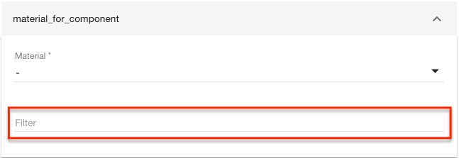 To create a filter which filters by material name we need to use "name" attribute. Enter {"name": "Material 1"} to the filter input. This filter will try to match all possible matches from existing list of materials. If there is the only one available option - the system will automatically take it, but if there is more than one - there will be a dialog in production asking to choose the specific material. |