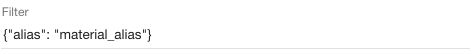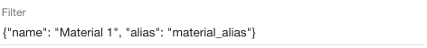 To create a filter which finds only very specific materials we need to use material name and alias combined. Enter {"name": "Material 1", "alias": "material_alias"}. This filter will try to find very specific material with the name "Material 1" and with the material alias "material_alias". |