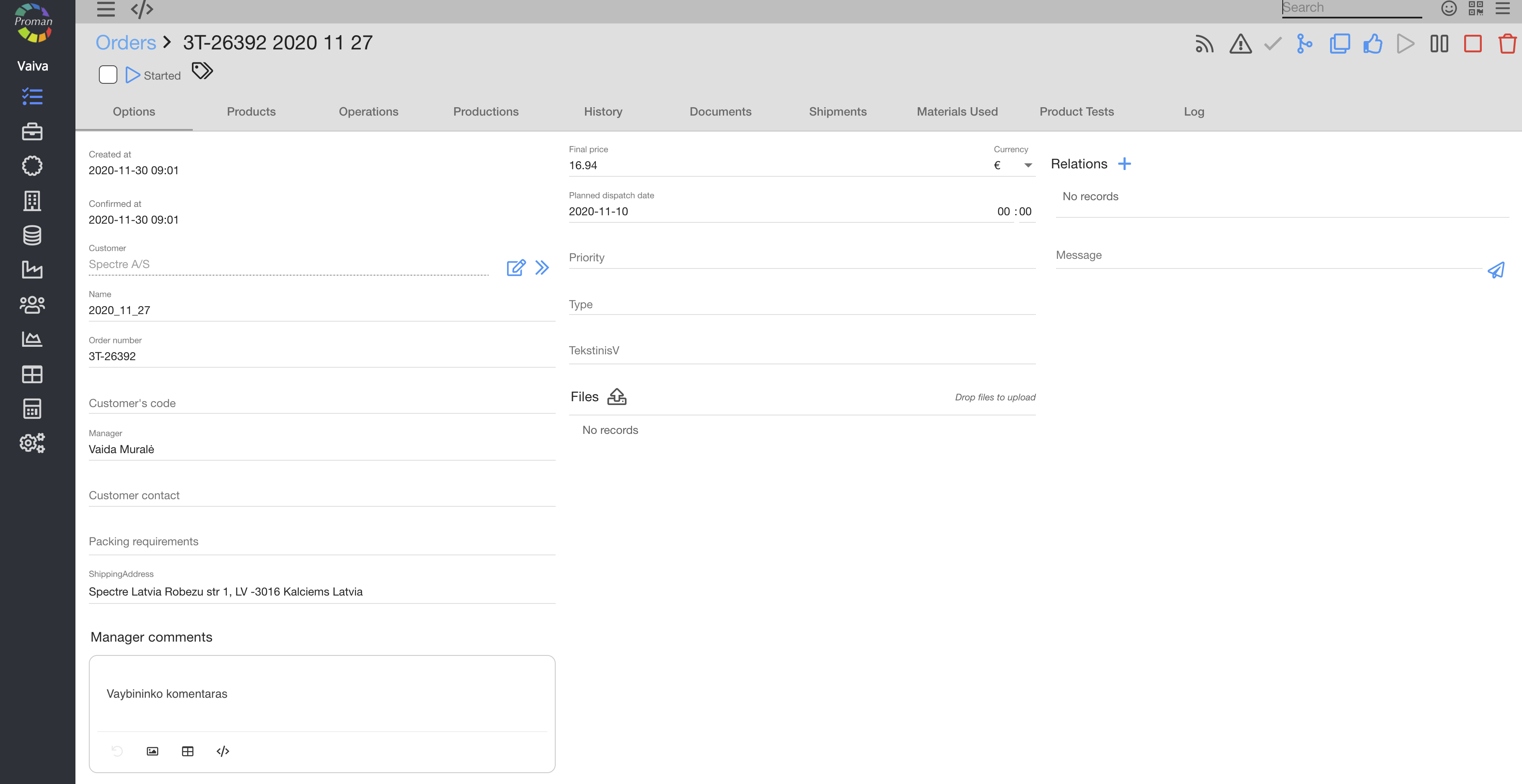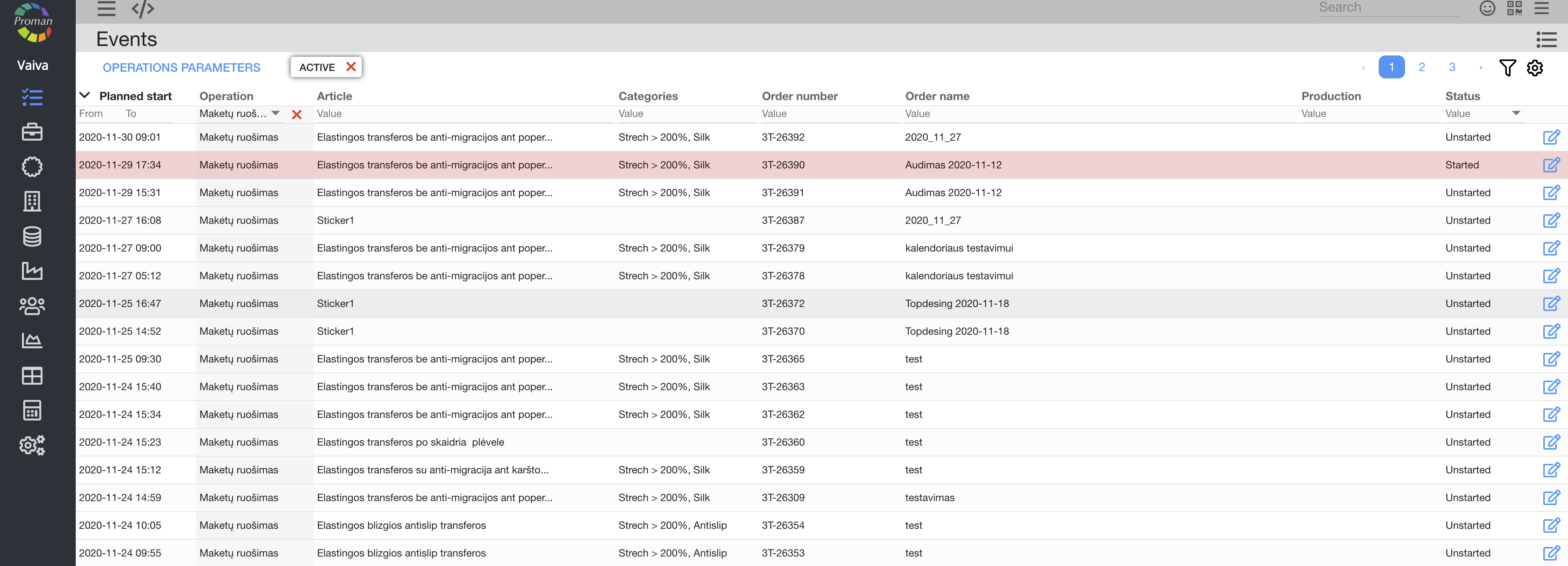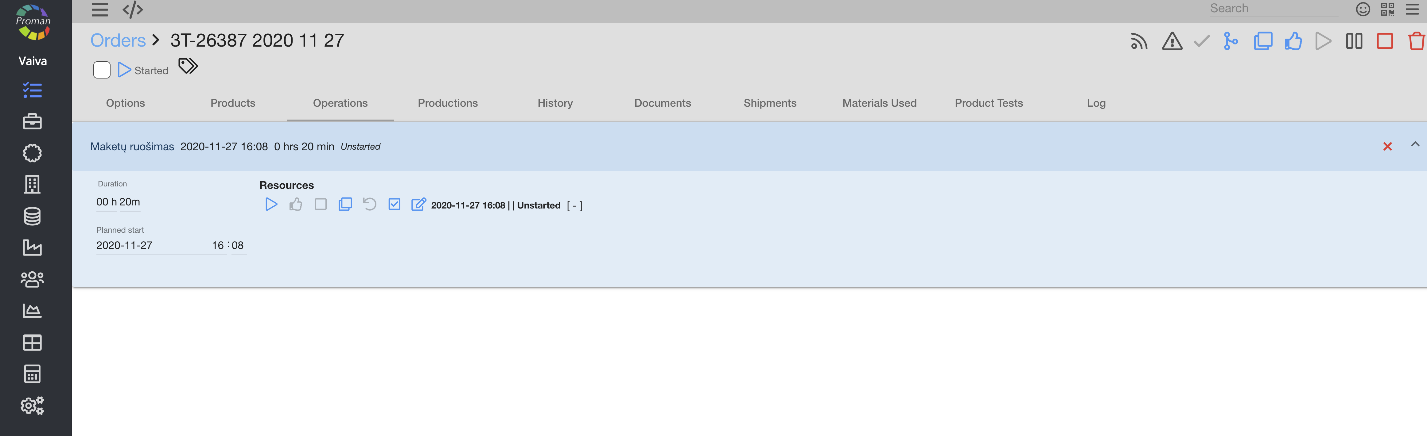 Calendar – production operation overview in a graphical representation of operation data in production. Workplace – entry about an employee in a workplace. Quality control – a process that is used to manage quality assurance. Material – any substance, with its own set of chemical composition, natural or generated from chemical elements or compounds. Parameter – physical, technical measure that describes the product, process (operation) or equipment feature. Order number – unique number for invoicing purposes. Order name – name that represents given order information as a short summary on what must be done. |