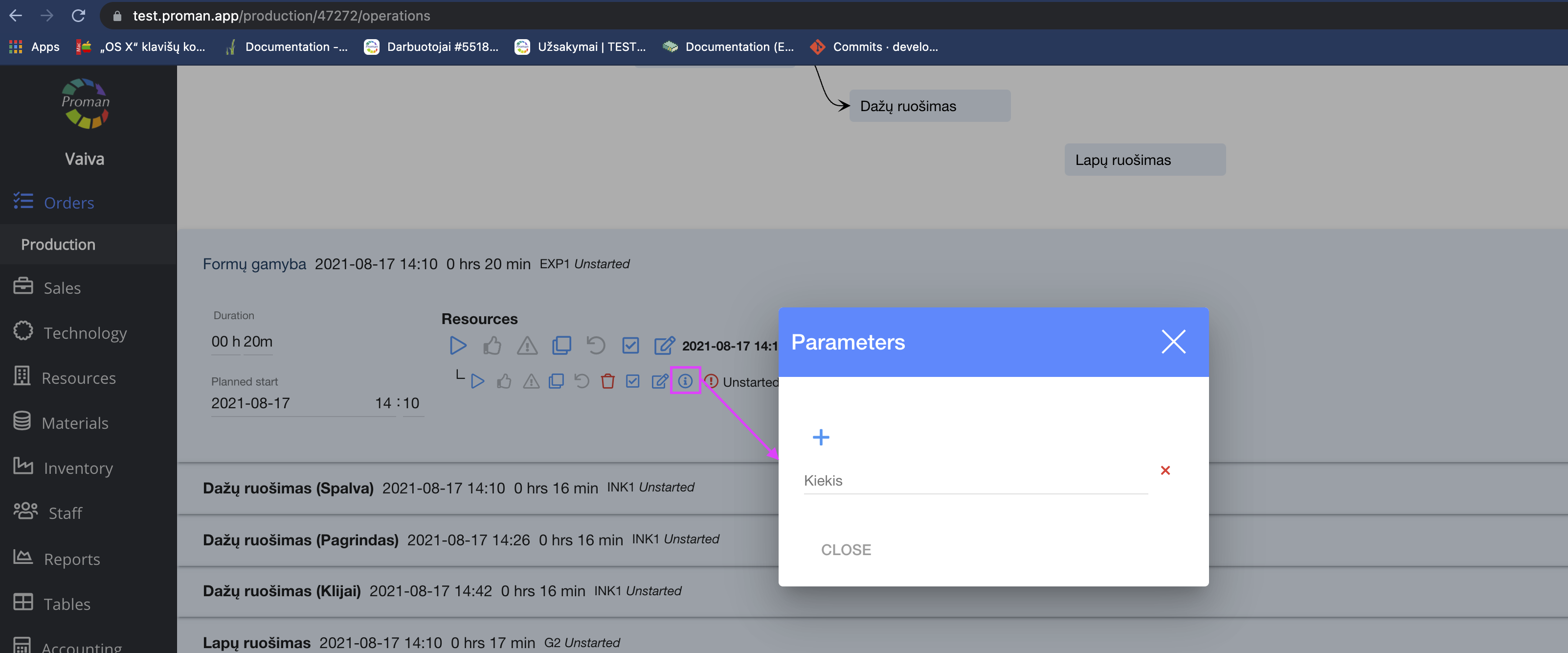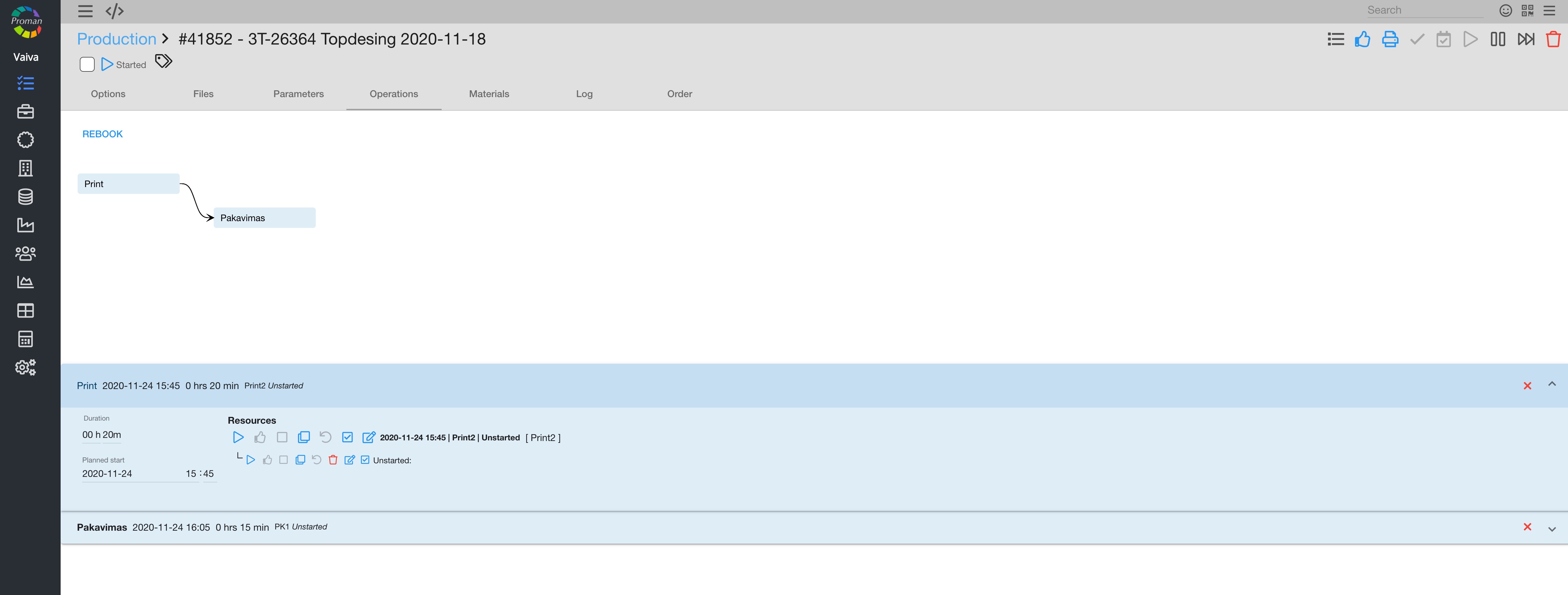 After creating the production operations, you can manage it with buttons: