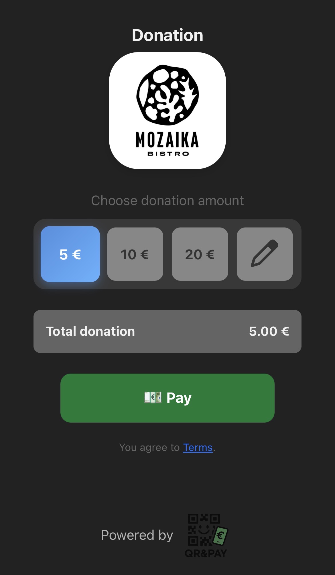 https://domain.smarton.app/pospublic/charity you will be able to leave 5, 10, 20 or custom amout as a donation to the user. After pressing pay button, it will redirect you to accept e-commerce page where you can leave payments by card Apple Pay Google pay and bank links.