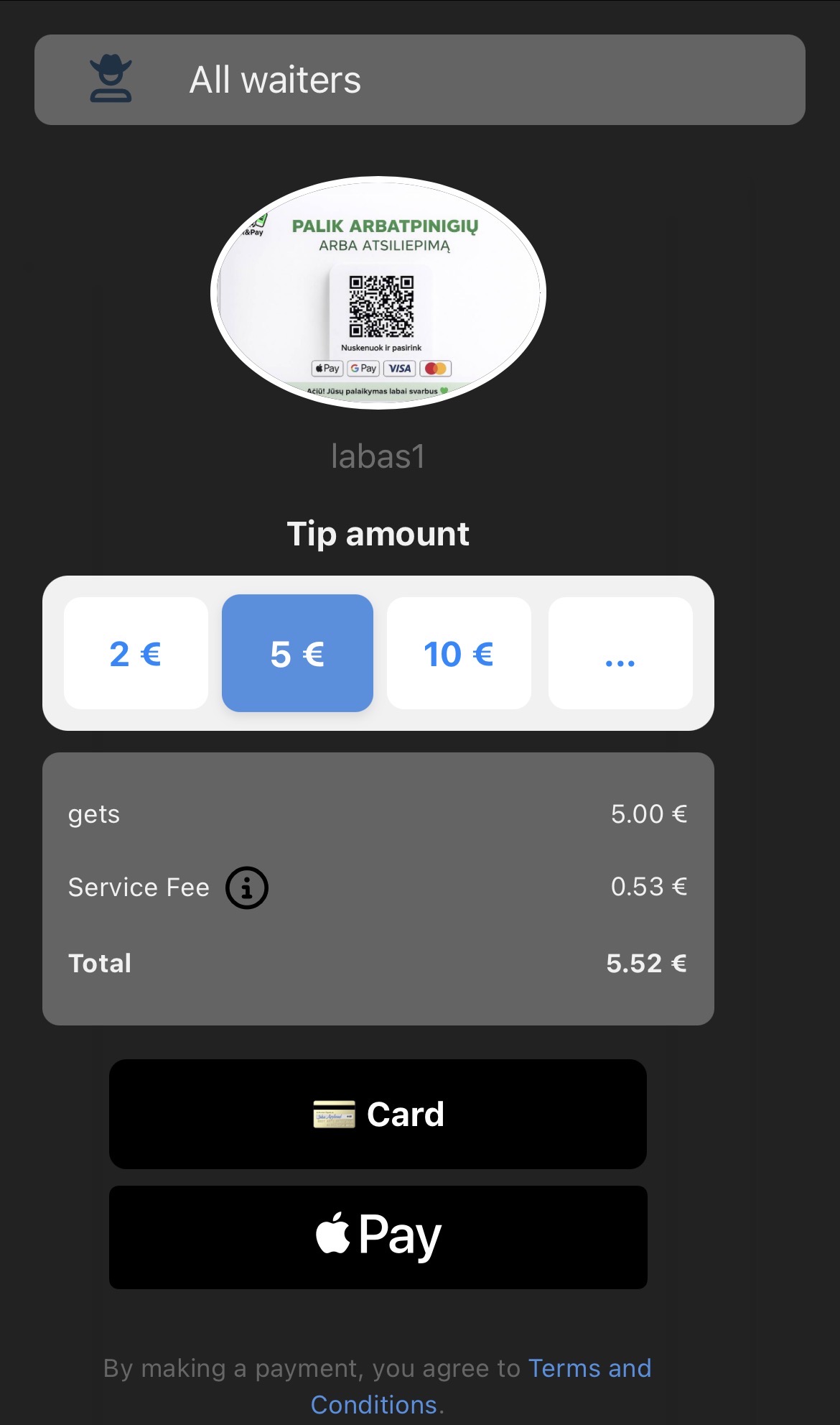 2. https://domain.smarton.app/pospublic/tips/{employee id} you will see employee card where to leave a tip. on iPhones there will be a button for Apple Pay and for androids who can accept Google pay it will show Google pay button by default. There’s always a card button where you can type your card information to take money.