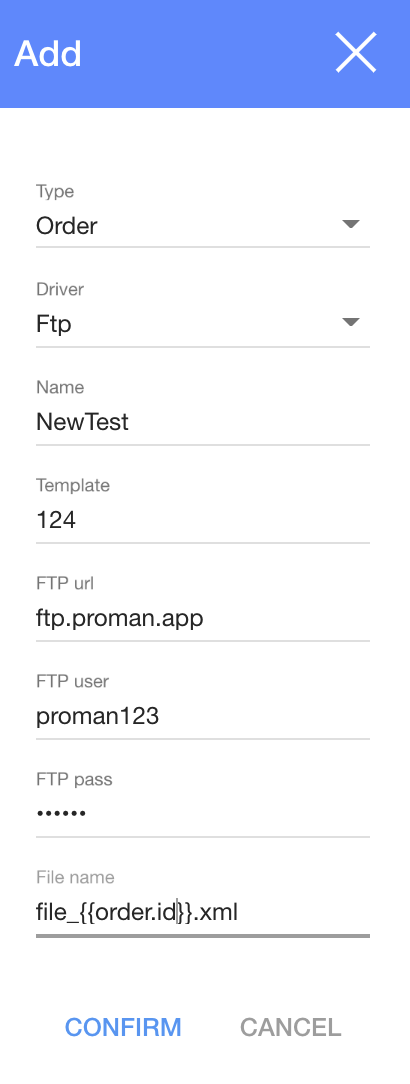 6. File name (Enter file name. which you want to create – file_{{order.id}}.xml Note: if you don’t write id, file overwrite in ftp server). You could also move files to INBOX this way: write this in Dialog table (File name: INBOX/file_{{order.id}}.xml)