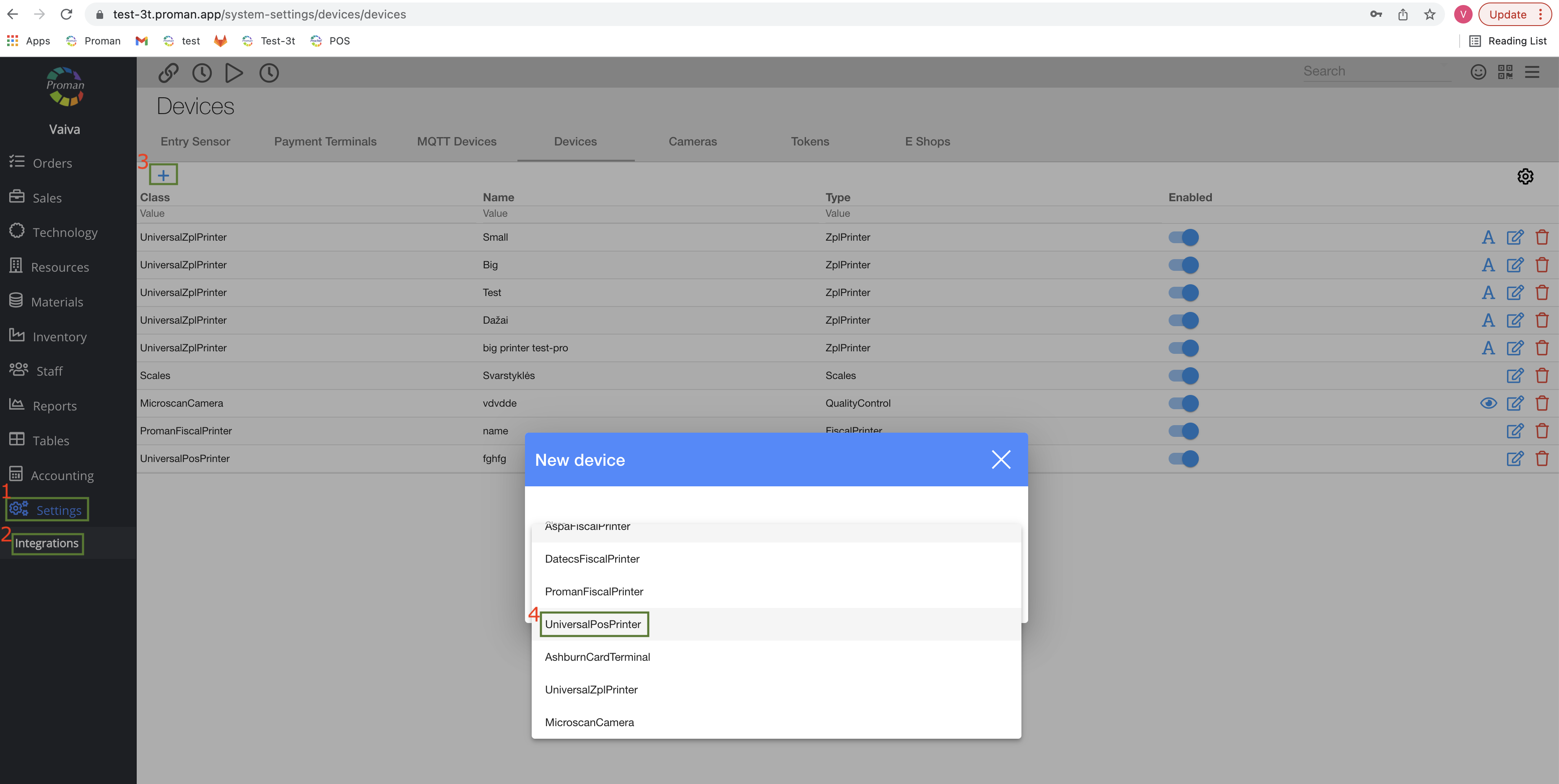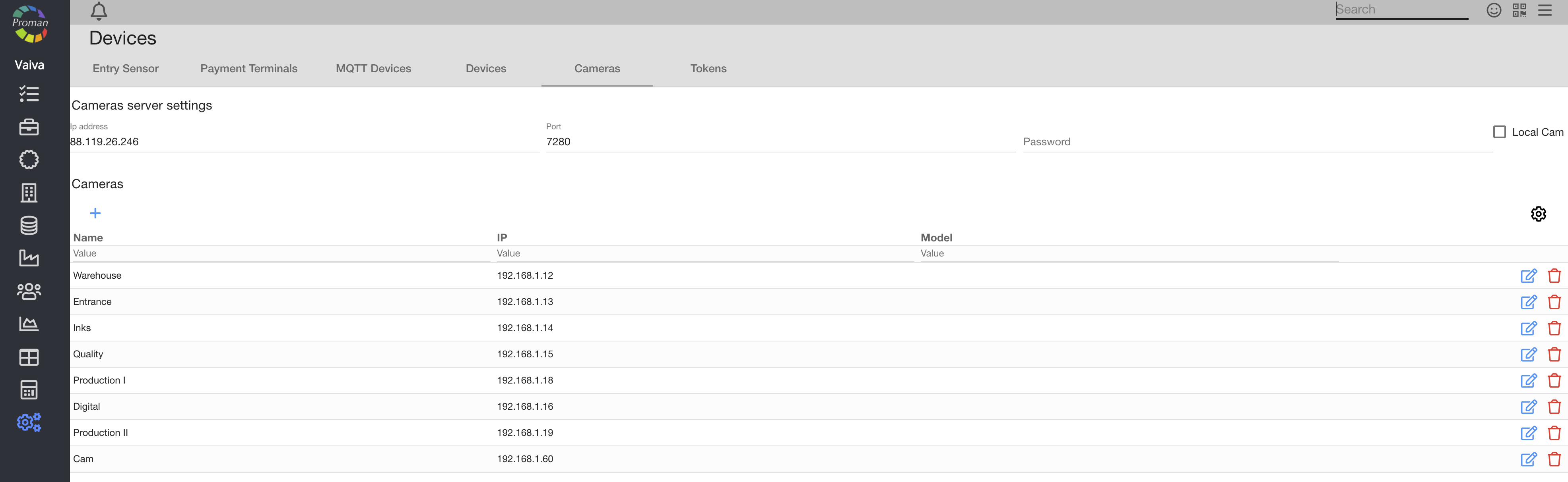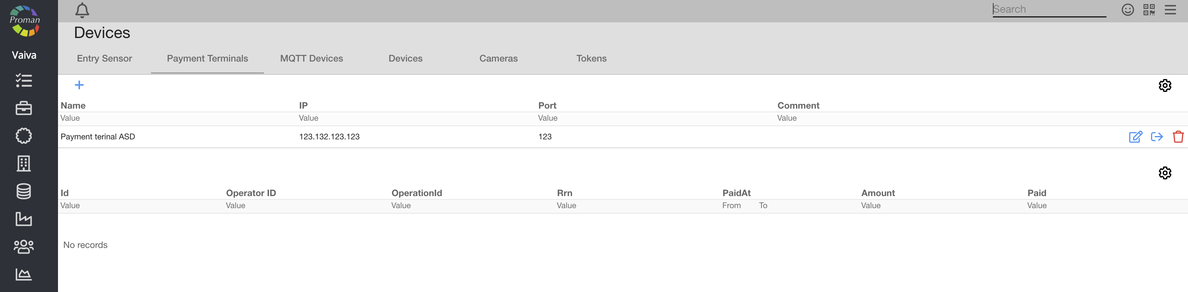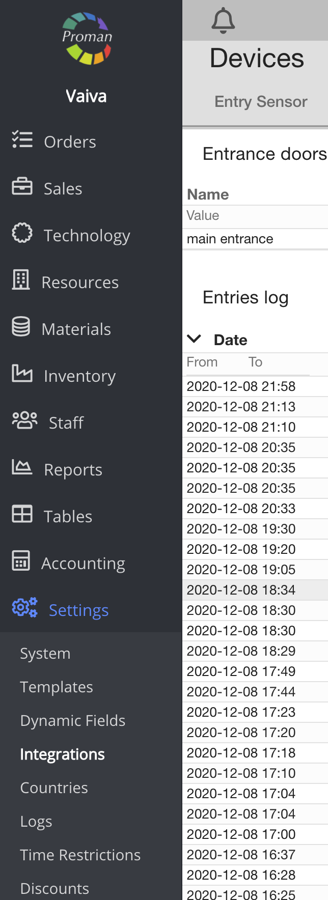 Here you can set up all integration settings, for example: entry sensors, payment terminals, MQTT, cameras, tokens and E- shops.