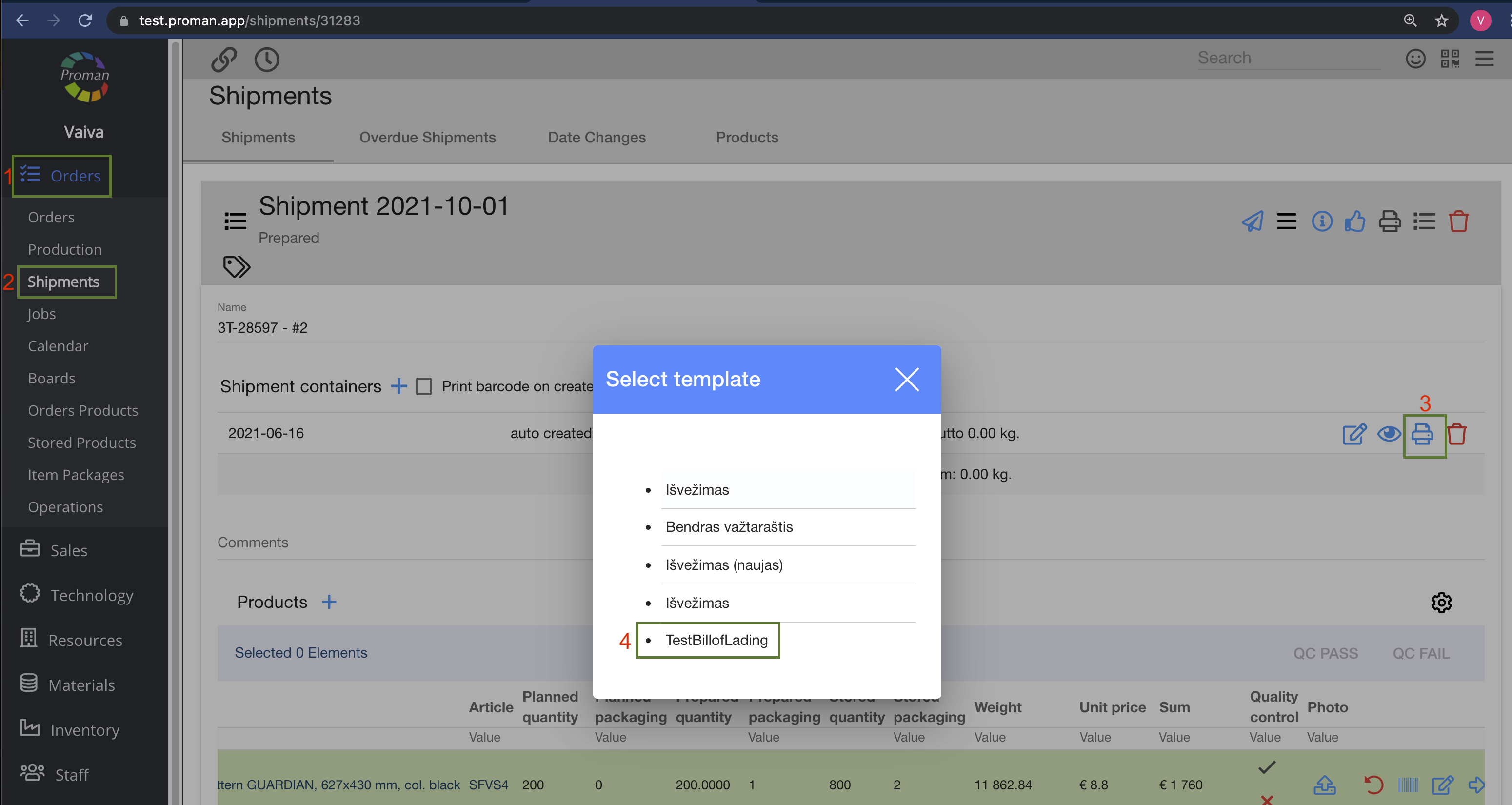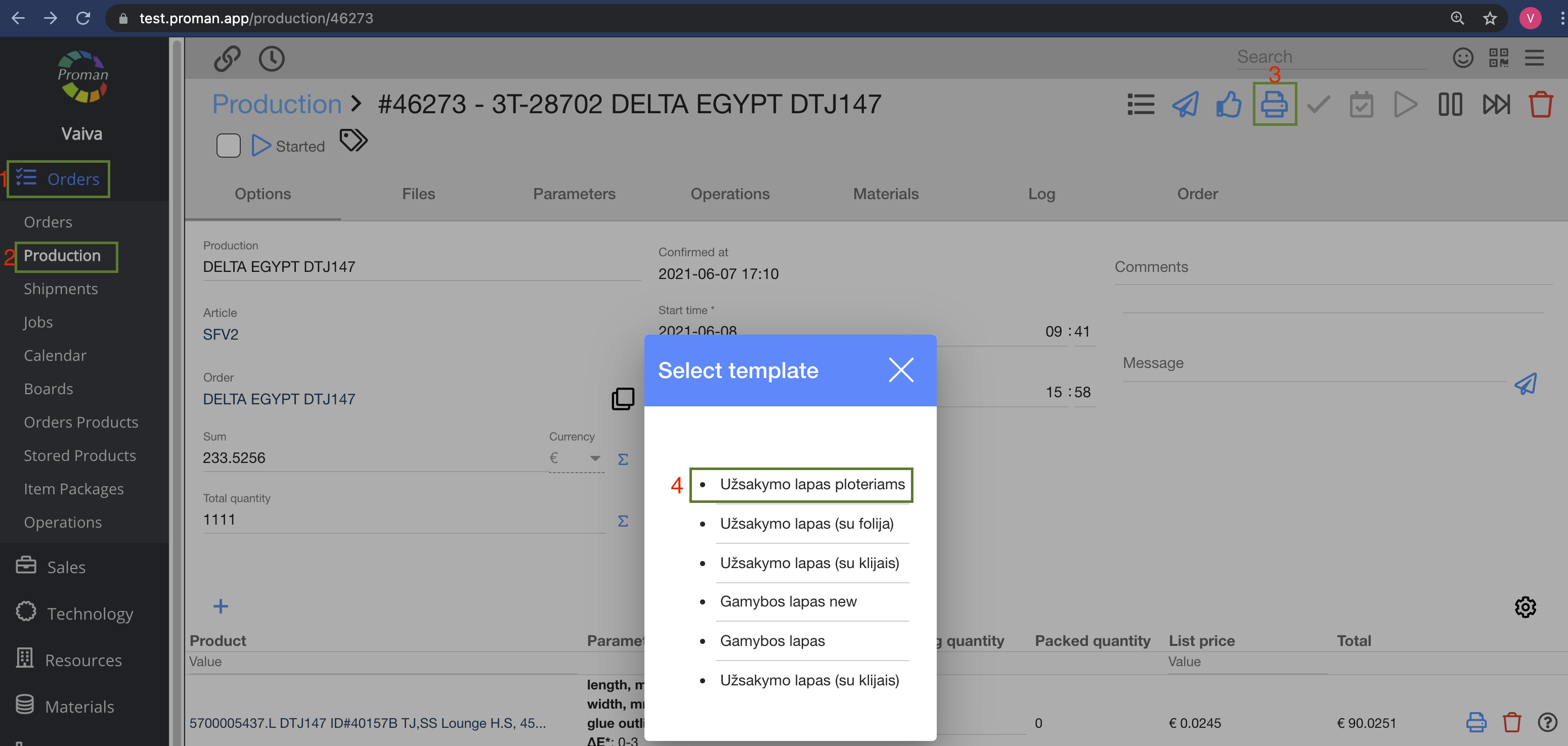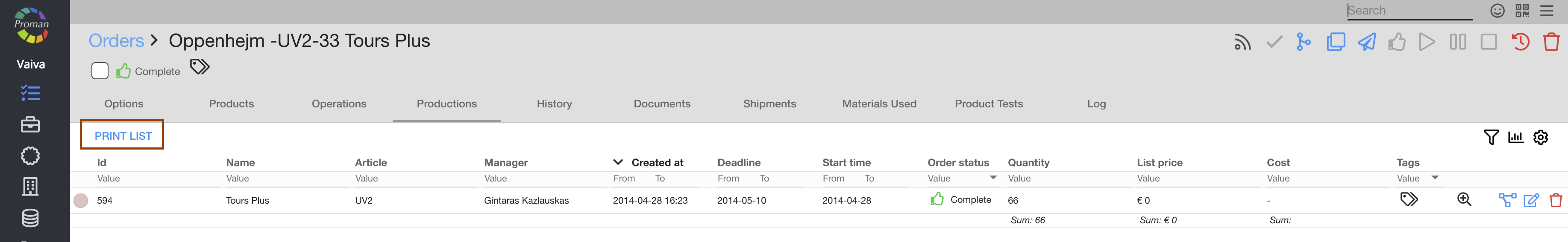 Orders -> Productions -> Choose product -> Order (in grey table) -> Productions (in grey table) -> PRINT LIST