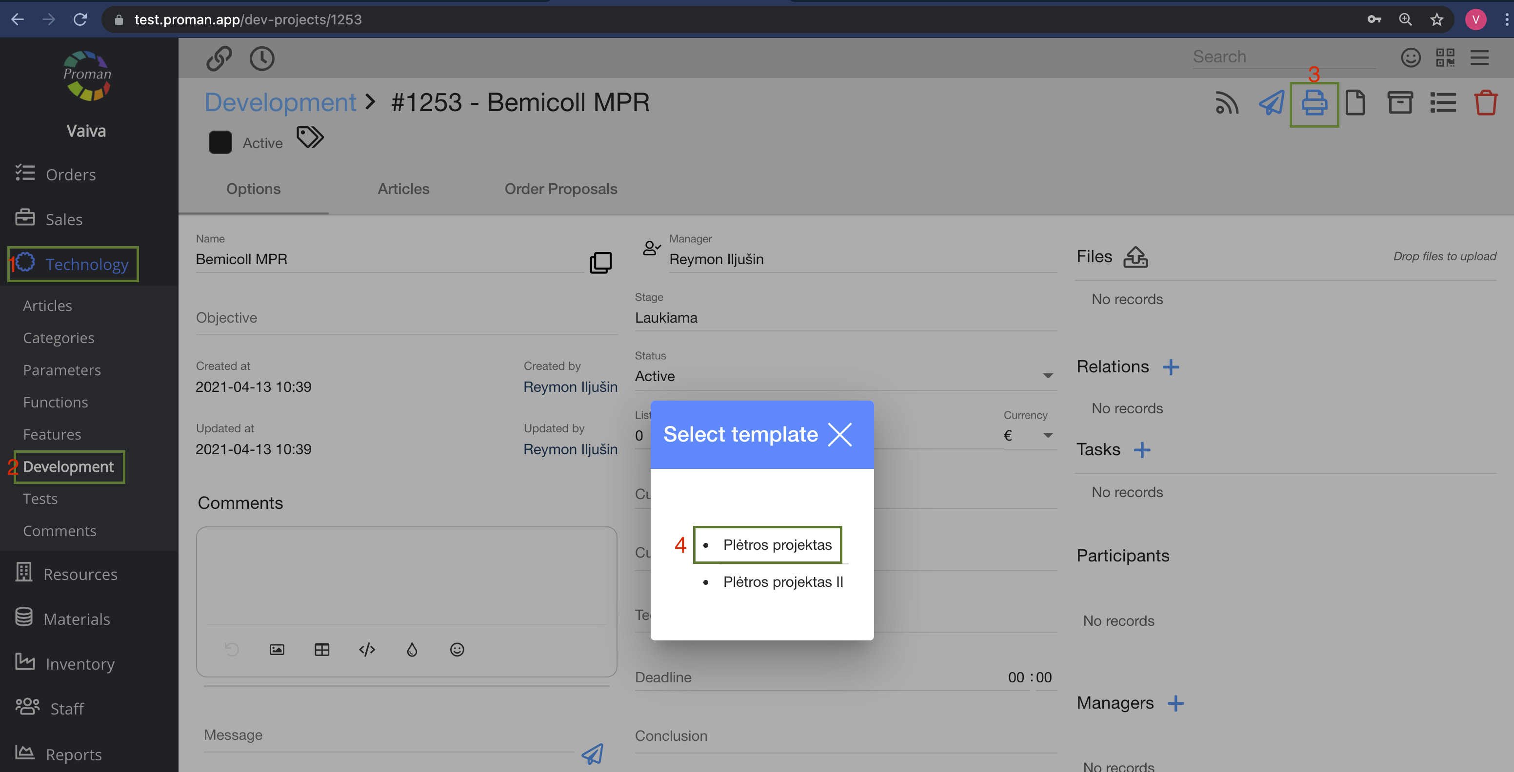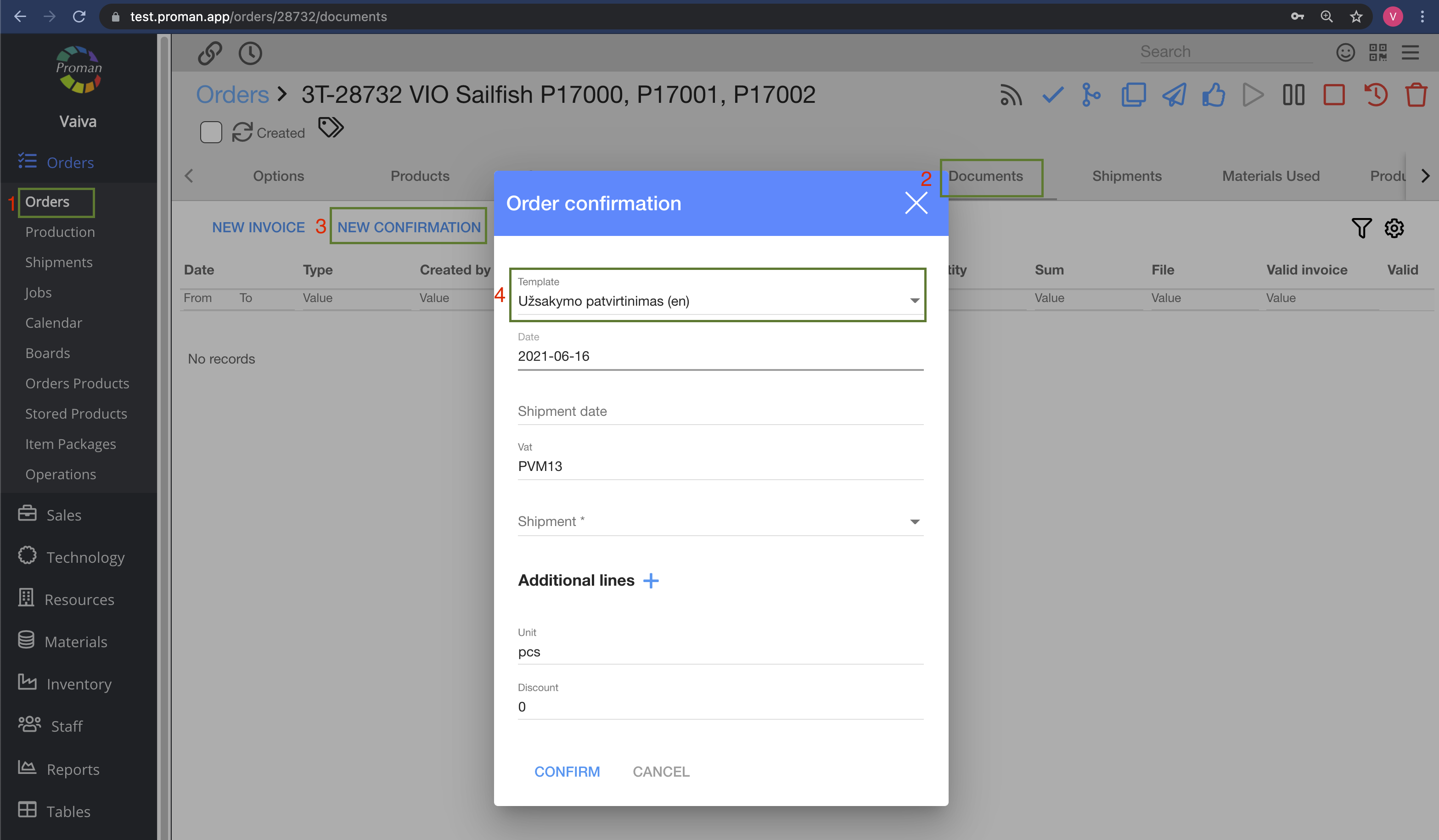 Orders -> Production -> Choose product -> Order (in grey table) -> Documents (in grey table) -> NEW CONFIRMATION -> Template