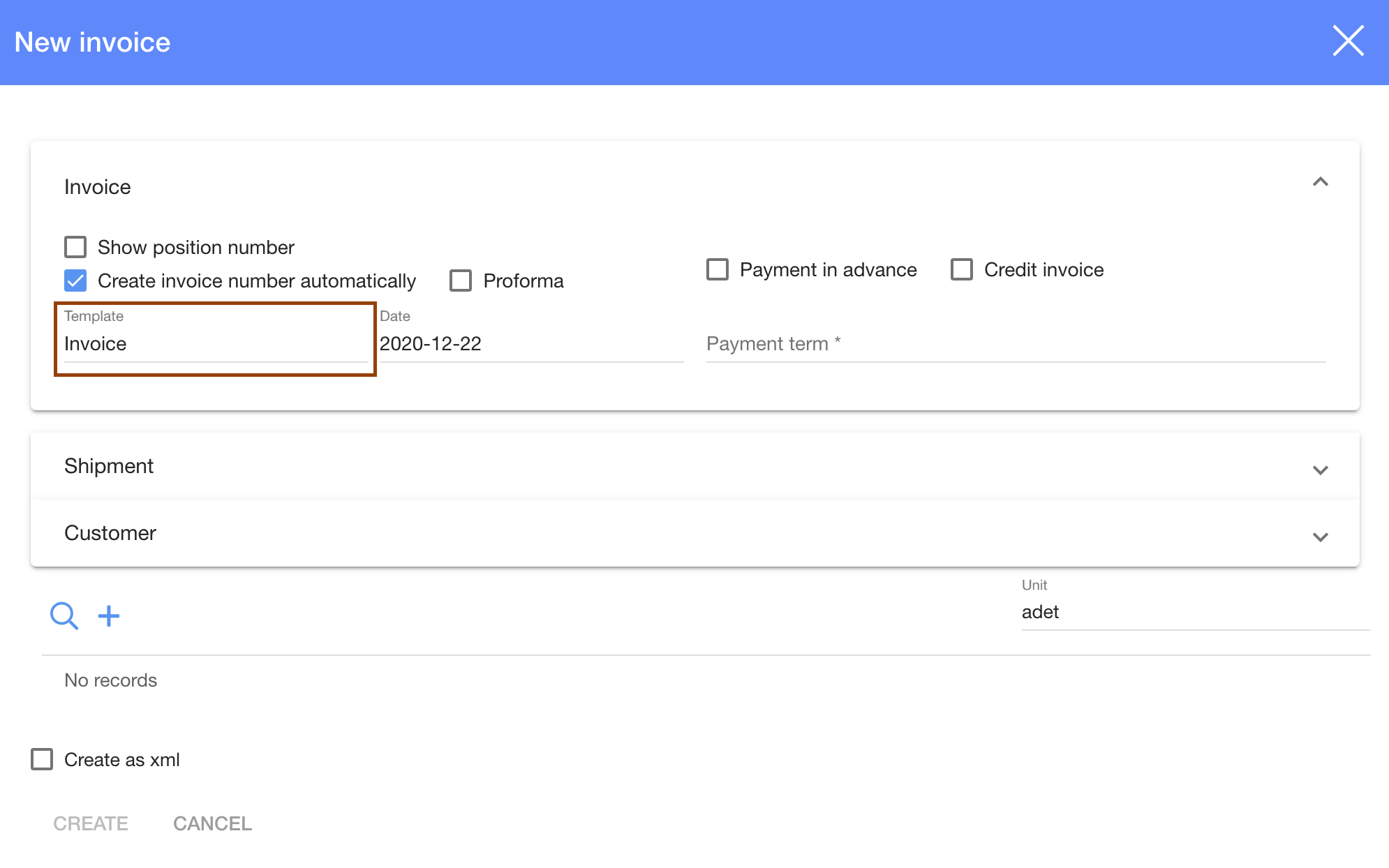 Orders -> Production -> Choose product -> Order (in grey table) -> Documents (in grey table) -> NEW INVOICE -> Template