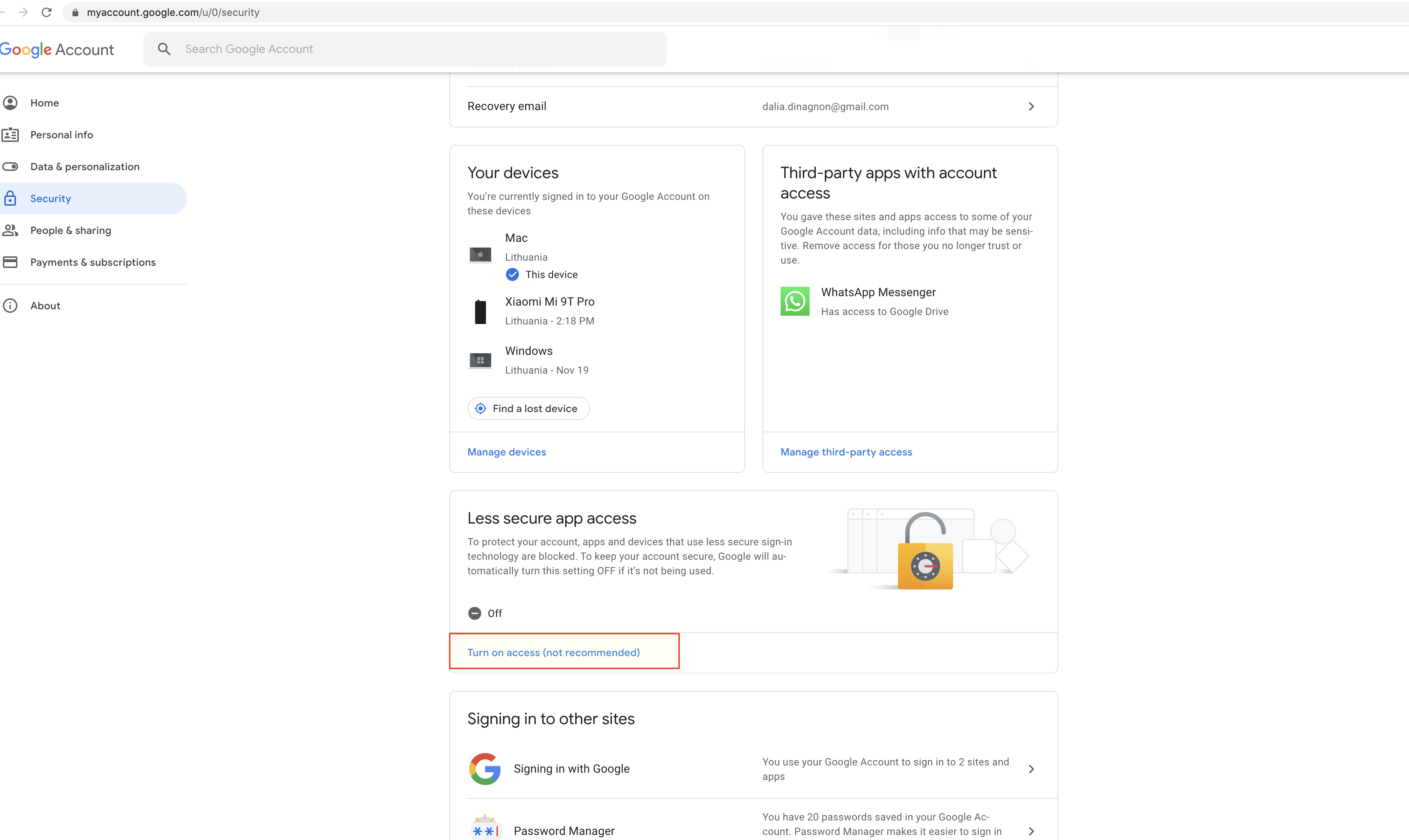 1.1. Find "Less secure app access" and click on "Turn on access (not recommended)"