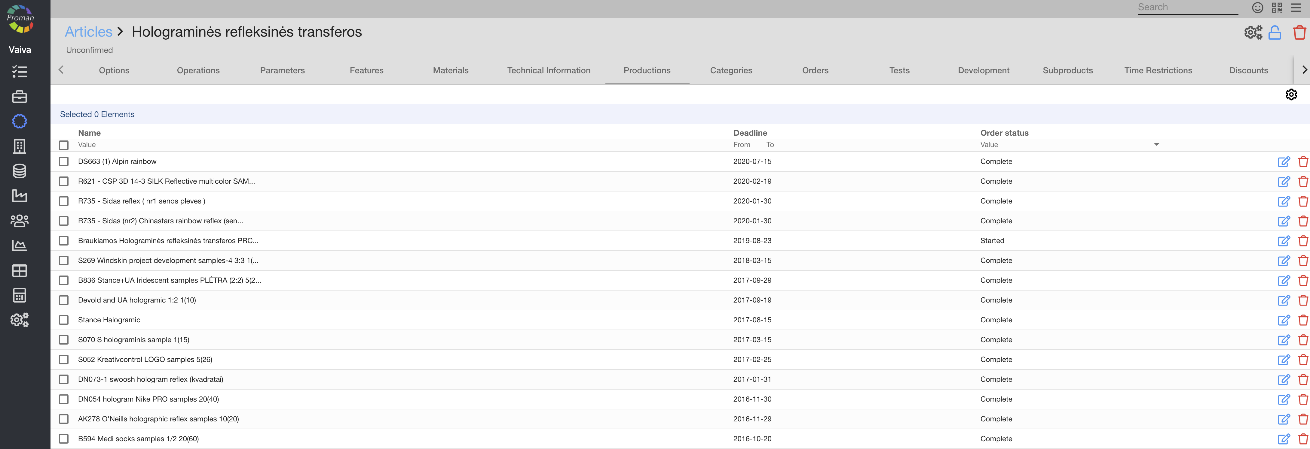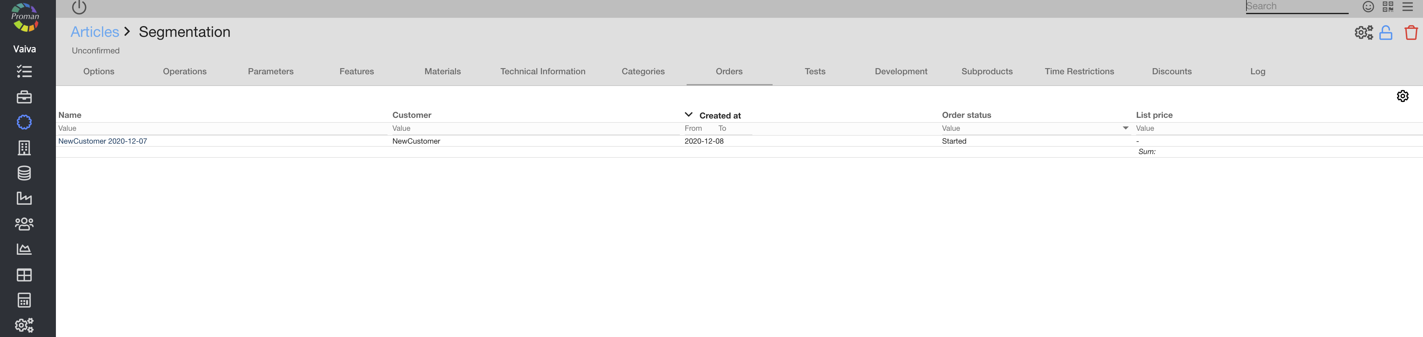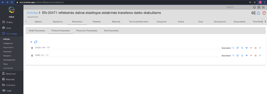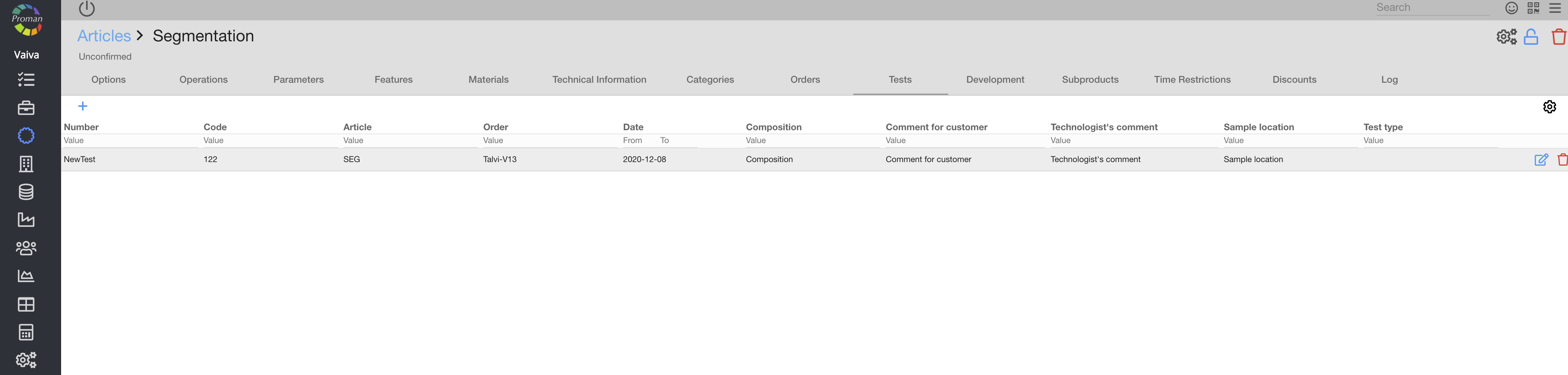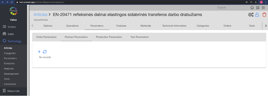 Here you can add, edit and delete Order, Product, Production and Test Parameters