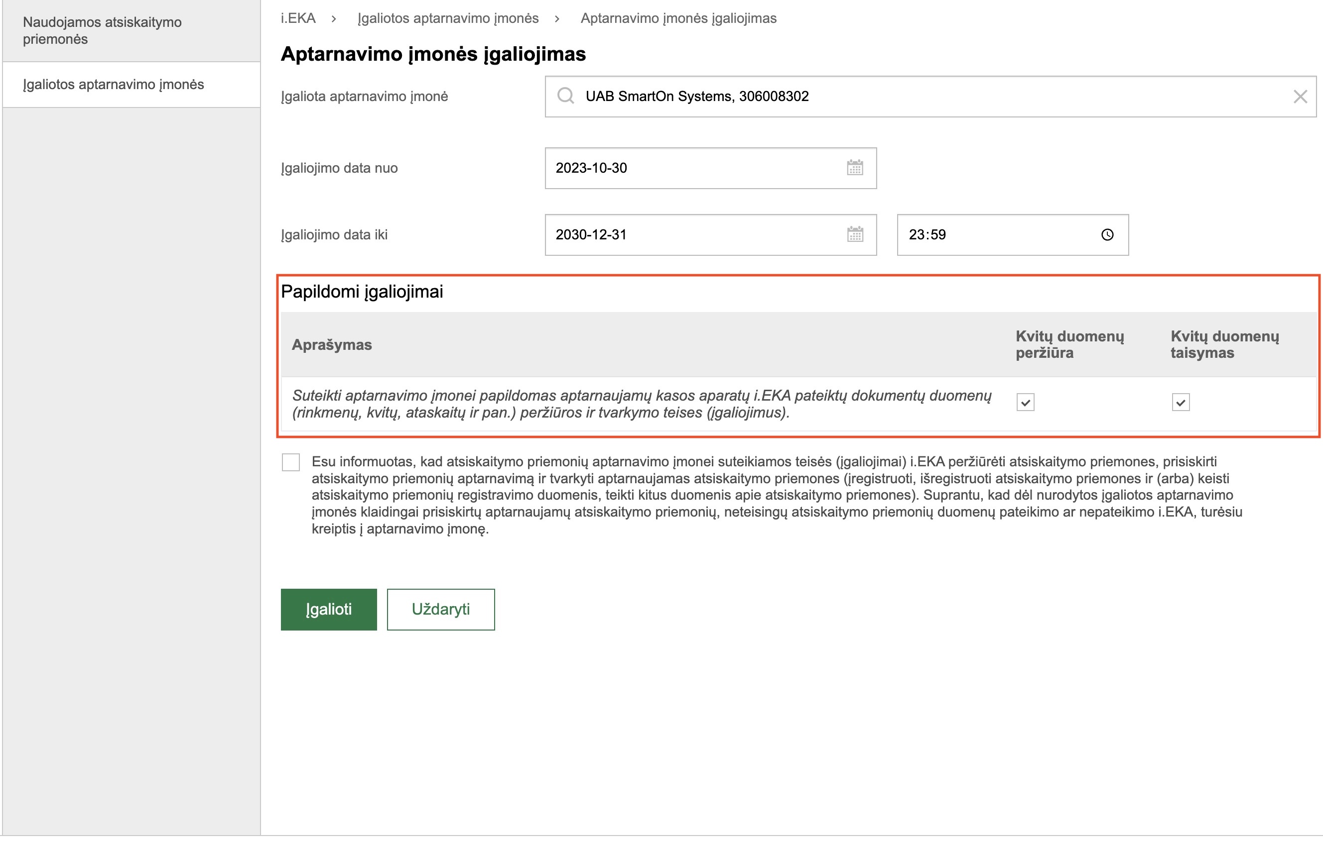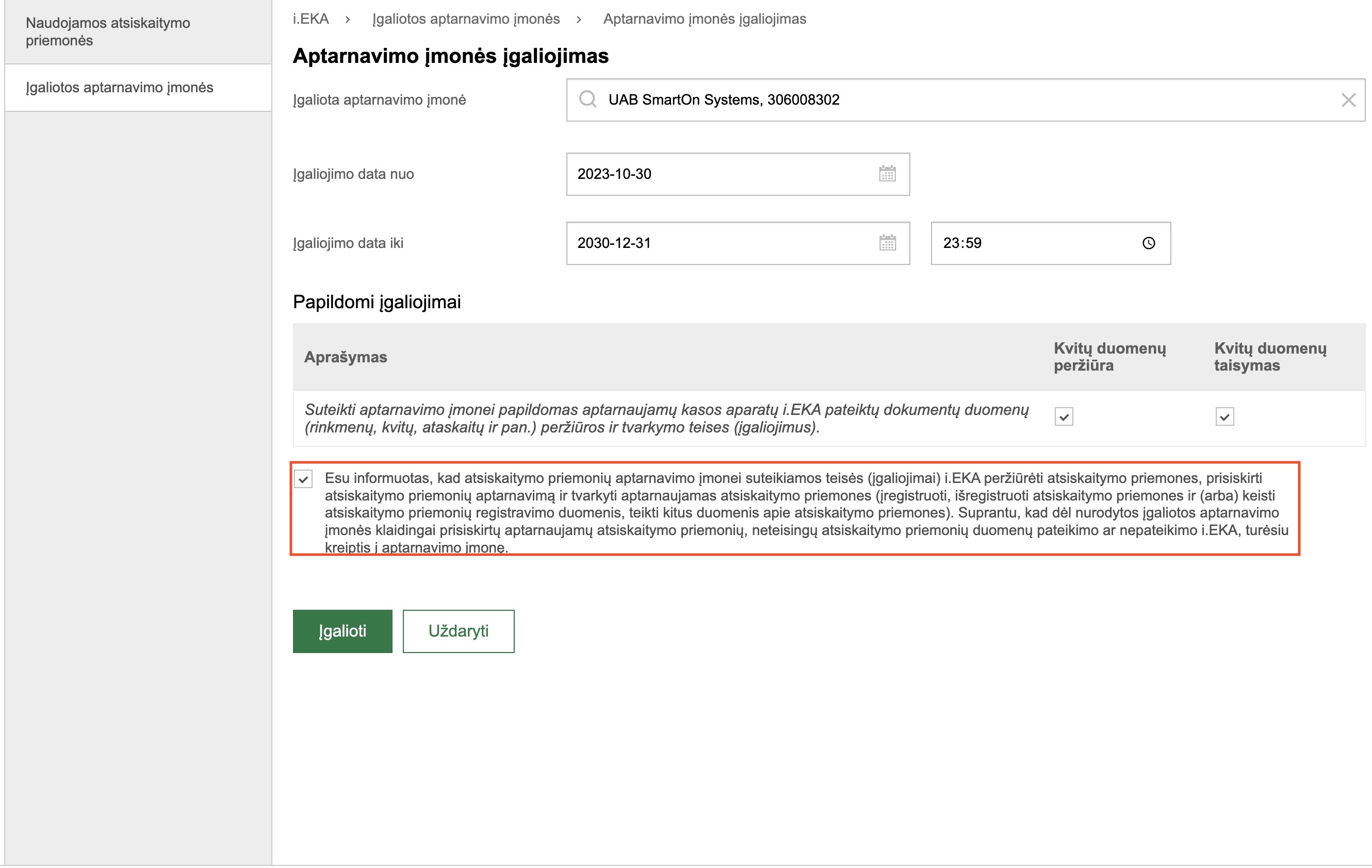Varnele pažymėkite susipažinimą su aptarnavimo įmonei suteikiamomis teisėmis. Tuomet spauskite mygtuką „Įgalioti“. Po šių veiksmų atlikimo įmonė galės administruoti atsiskaitymo priemones.