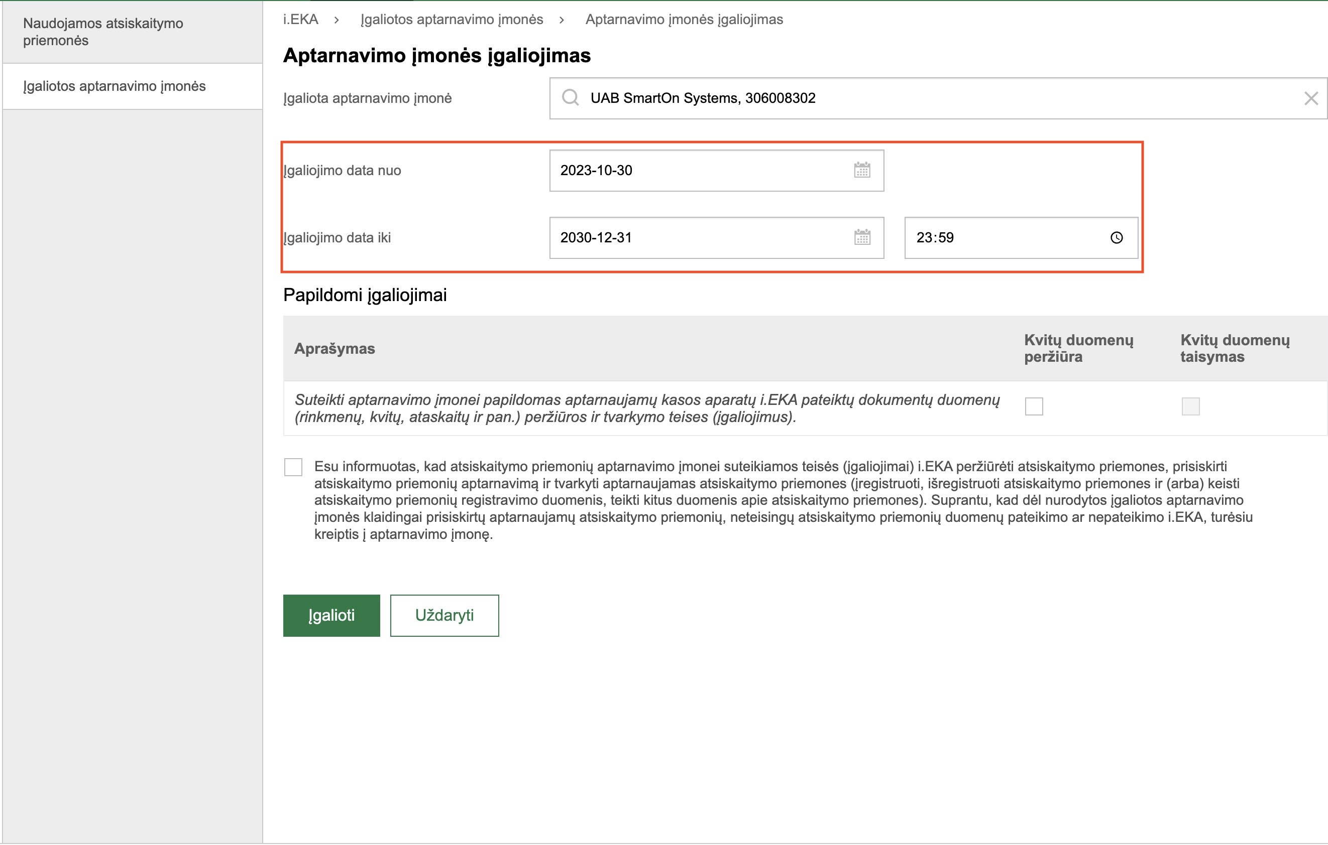 Eilutėje „Įgaliojimo data nuo“ nustatykite įgaliojimo pradžios datą. Šioje eilutėje žymima tos dienos data, kurią priskiriamas įgaliojimas. Atbuline data įgaliojimo suteikimas negalimas. Eilutėje „Įgaliojimo data iki“ nustatykite įgaliojimo pabaigos datą. Šioje eilutėje rekomenduojame žymėti tolimesnę datą. Kitu atveju, kiekvieną kartą pasiekus Įgaliojimo pabaigos datą, įgaliojimo priskirimą turėsite atnaujinti.