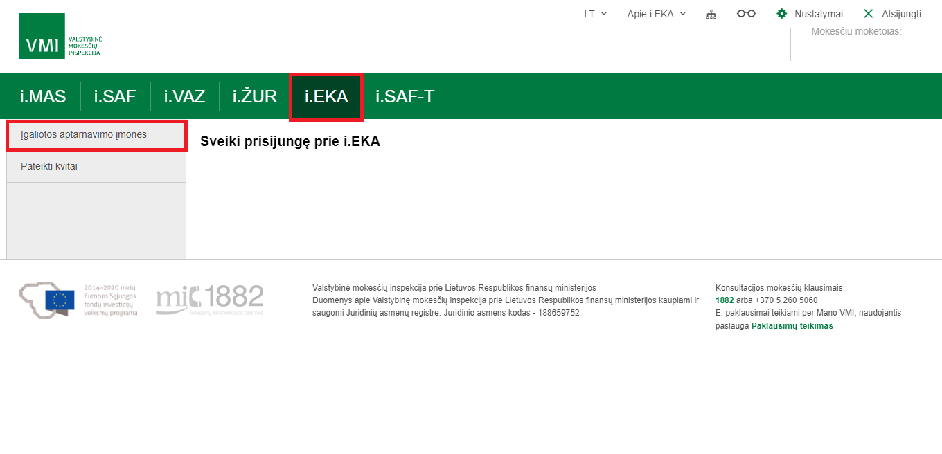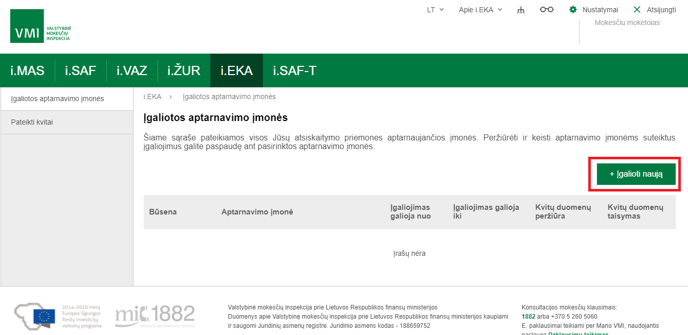 Prisijungę prie i.EKA, kairiajame šone pasirinkite skiltį „Įgaliotos aptarnavimo įmonės“.Įgaliotų aptarnavimo įmonių lange, norėdami pridėti naują įgaliojimą, dešinioje pusėje spauskite mygtuką „Įgalioti naują“.