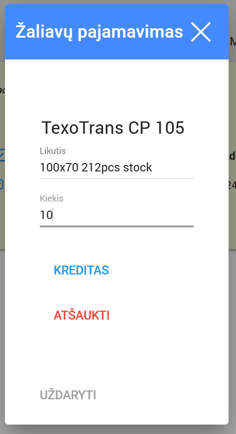 2.2. Pasirinkime norimą medžiagą (iš šablonų arba įveskime brūkšninį kodą), įveskime likutį ir kiekį;