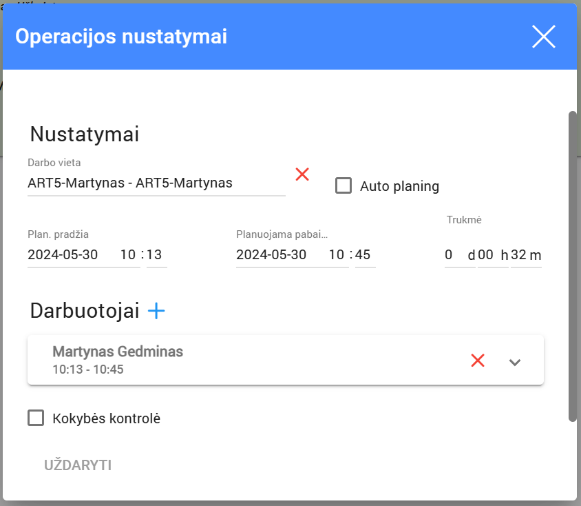 Sukūrus operaciją, ją galima valdyti mygtukais: