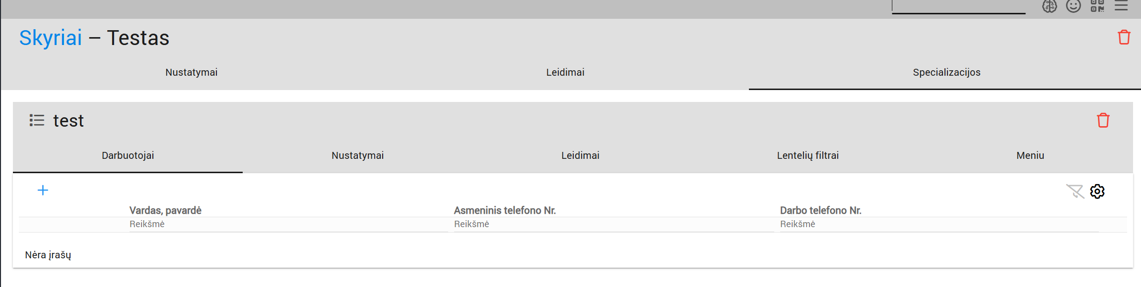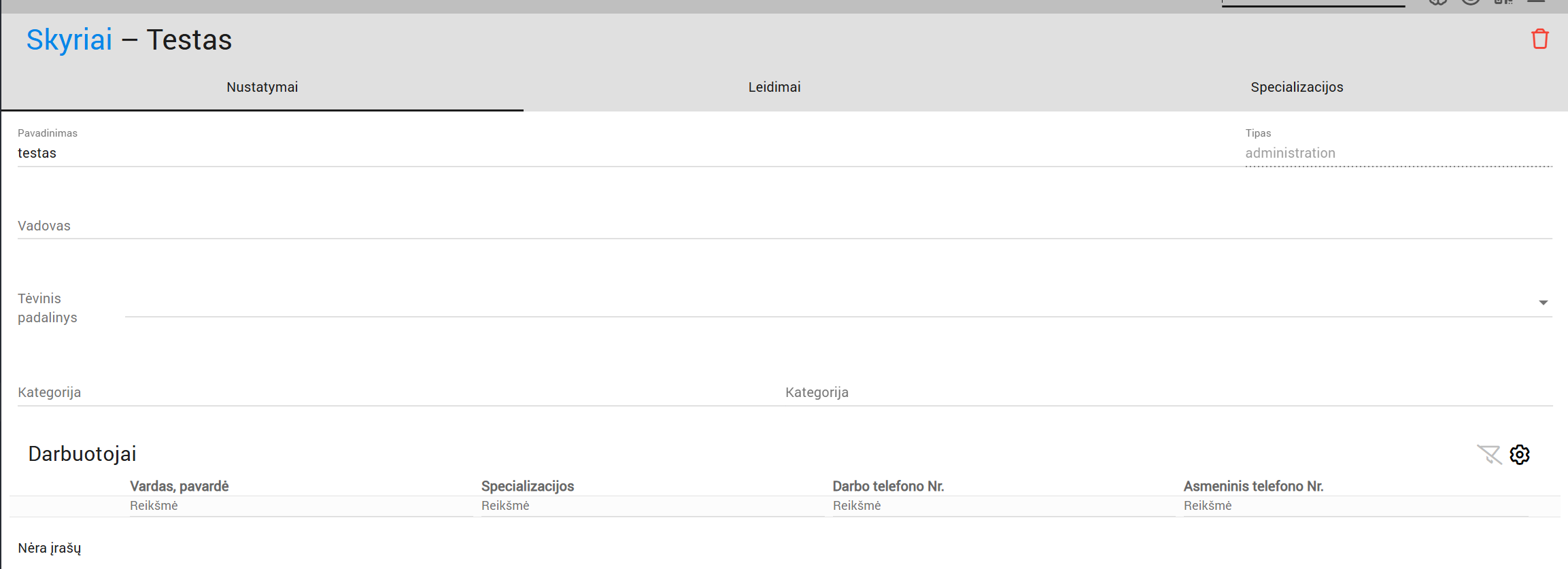 Departamentai yra padaliniai, padedantys susisteminti verslą į mažesnius ir kontroliuojamus gabalus. Kiekviename skyriuje gali būti kelios specializacijos ir darbuotojai, kuriems suteikiami iš anksto nustatyti sistemos leidimai.